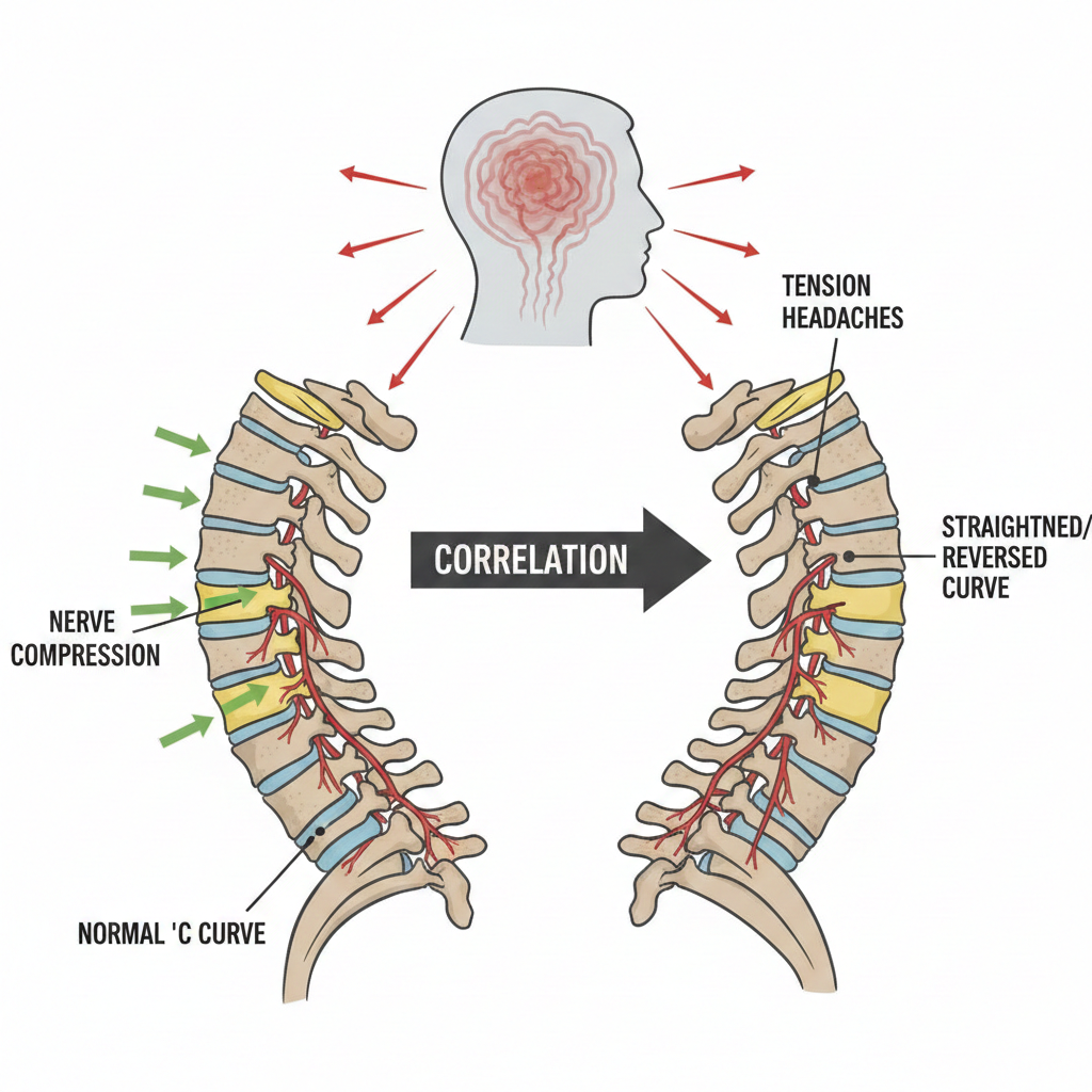 가이드: 경추의 C자 곡선을 유지하지 못할 때 발생하는 신경 압박과 긴장성 두통의 상관관계.