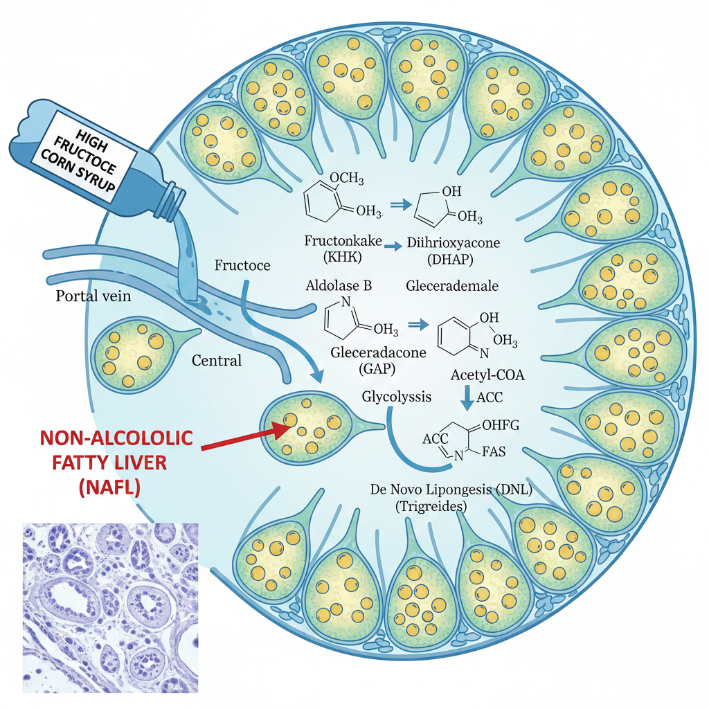 액상과당이 간에서 직접 대사되어 비알코올성 지방간을 유발하는 과정을 과학적으로 분석.